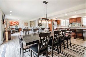 The open-concept main floor is filled with natural light and features a modern, fully-equipped kitchen with a large island, a spacious living room with a comfortable sectional sofa, and a dining area centered around a cozy indoor gas fireplace.