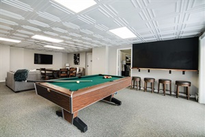 * Lower-level game room with a pool table and bar area.