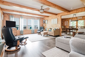 Step inside to a bright, welcoming living area with expansive windows showcasing beautiful lake views. The modern, fully-equipped kitchen is ready for your culinary adventures, while multiple cozy bedrooms provide restful nights after a day of fun.